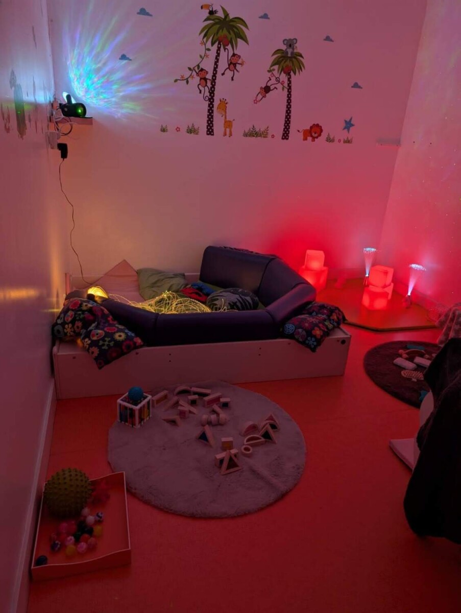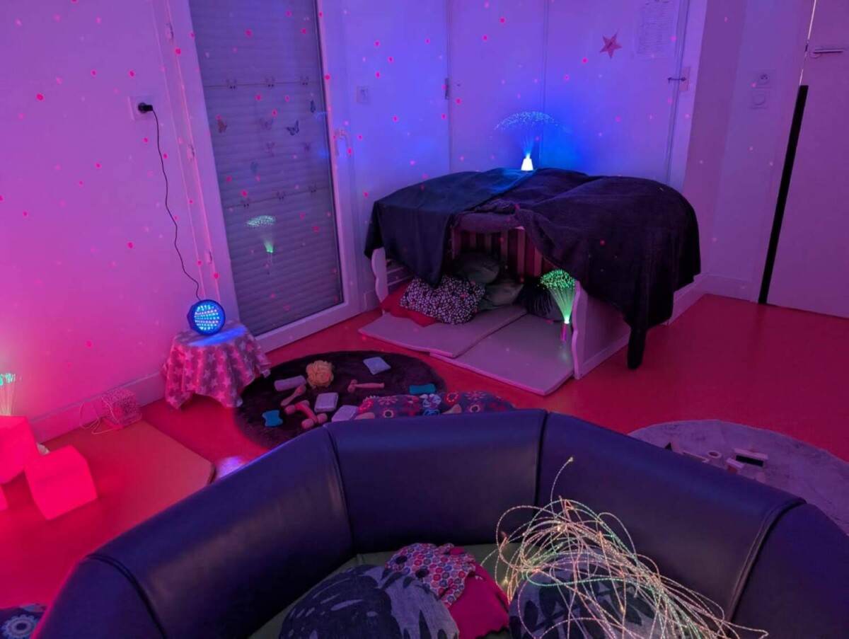 Les enfants en situation de handicap ou non car ces salles s’adressent à tout le monde, peuvent être stimulés aussi bien par le diffuseur d’huiles essentielles que par le ciel étoilé, les fibres optiques tombant en cascades comme les tapis de sols inégaux.